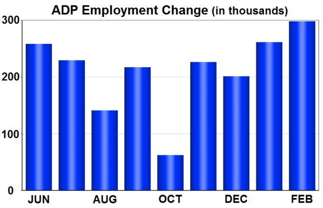 ADP, a private payroll company, released an estimate of private sector job gains two days before the key monthly Nonfarm Payroll Report from the Bureau of Labor Statistics (BLS). While the two reports vary widely in some months, big surprises in the ADP report often shift investor expectations for the BLS report. On Wednesday, ADP estimated that the economy added 298,000 private sector jobs in February, far above the expected level of 190,000, and the figures for January were revised higher. This was the largest monthly increase since April 2014, and the gains were well distributed between services, construction, and manufacturing. This data was great news for the economy. However, since stronger economic activity raises the outlook for future inflation, the report was bad for mortgage rates.